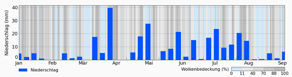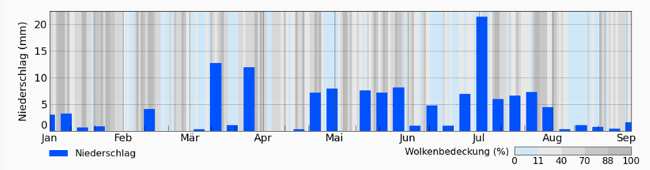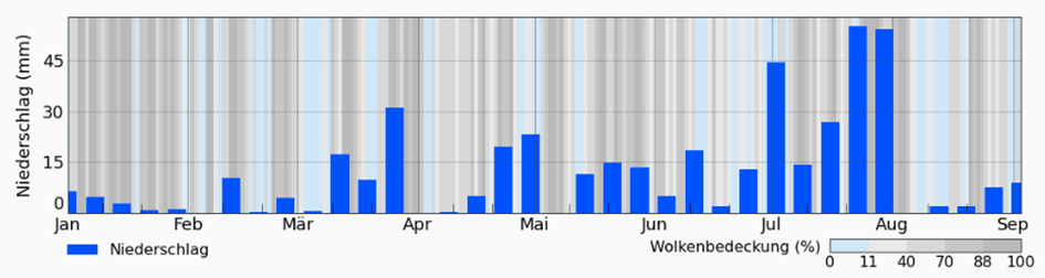 Niederschlag 2025 in Aichau [Quelle MeteoBlue: https://www.meteoblue.com/de/wetter/historyclimate/weatherarchive/aichau_%c3%96sterreich_2782909?fcstlength=1y&year=2025&month=9]